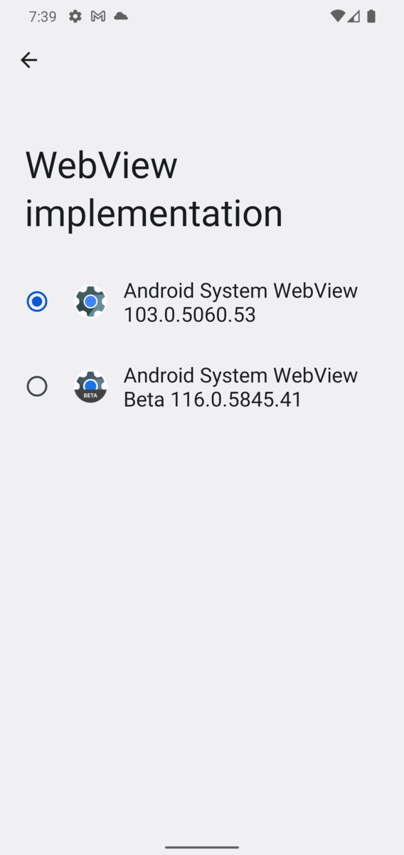 WebView 実装で何を使うかは開発者向けオプションから選択できる。Android 10 以降では WebView がデフォルトなので、それ以降なら何もしなければ WebView なはず。